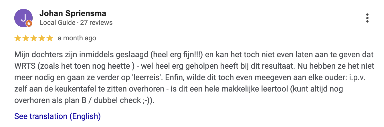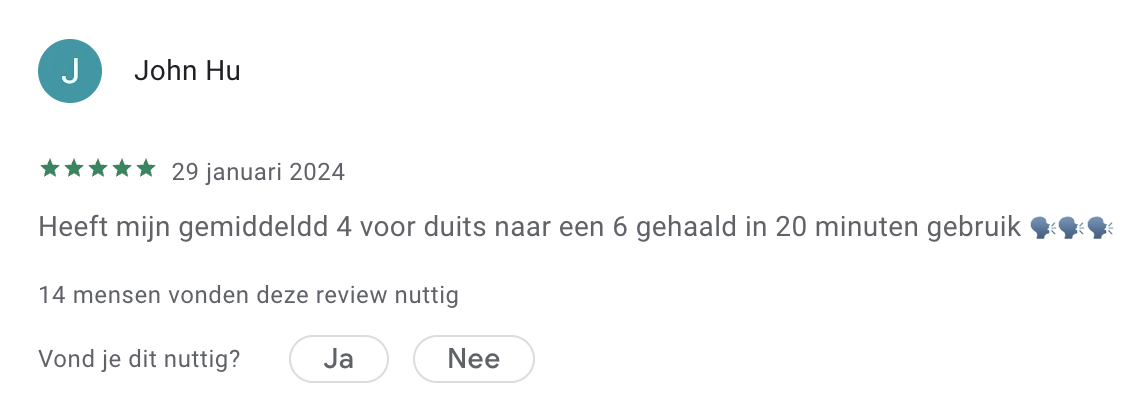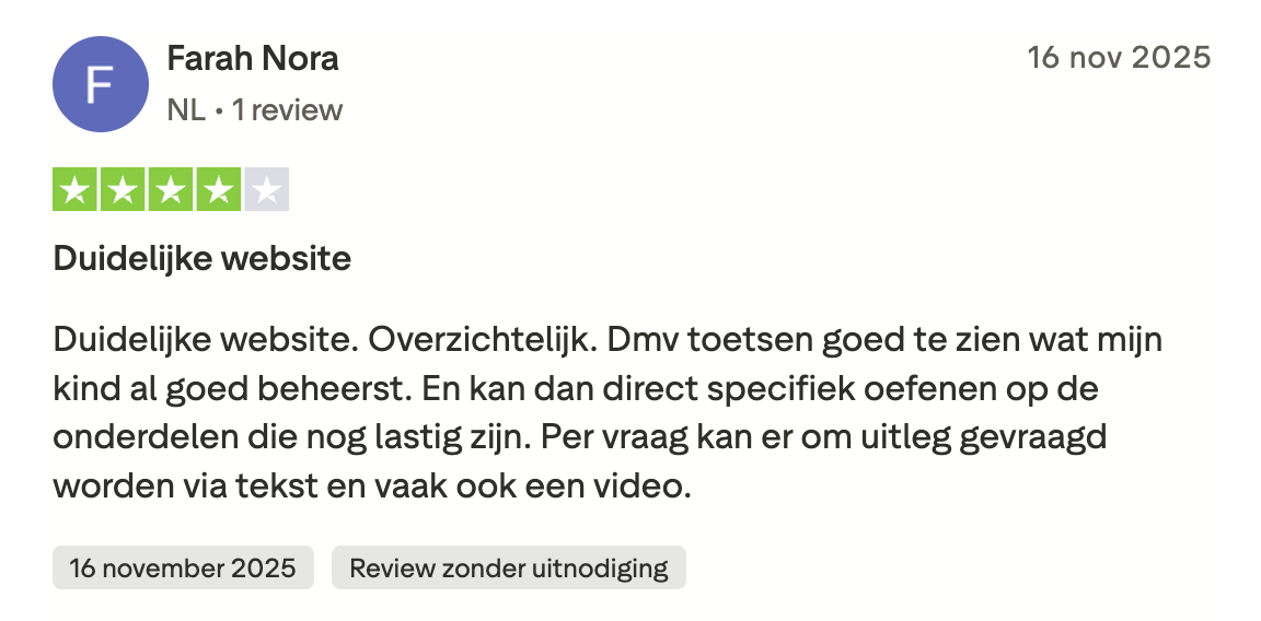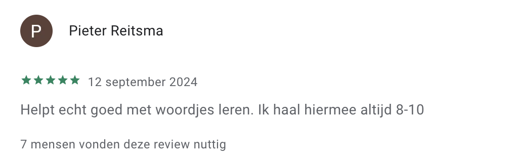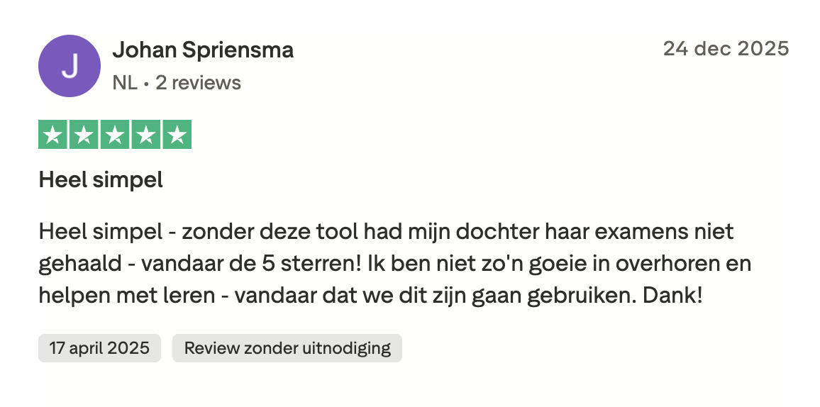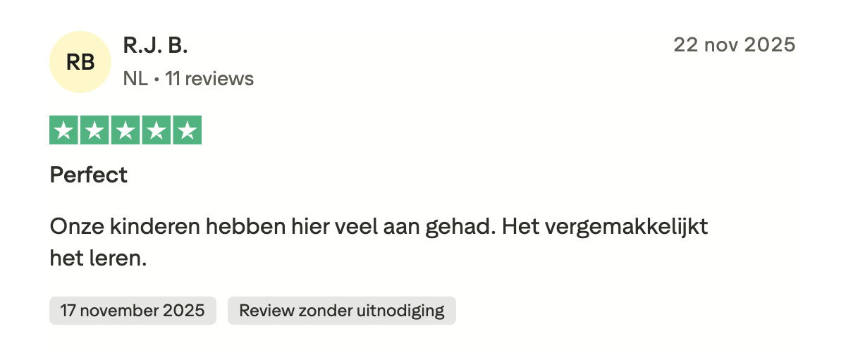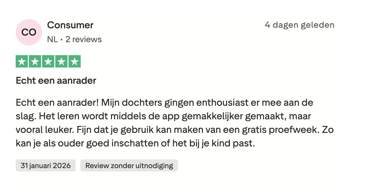 Hieronder zie je een selectie van ervaringen die we dagelijks terugkrijgen, uit reviews en berichten die ouders en leerlingen ons mailen. Alle reviews zijn ook te lezen op Trustpilot, Google Play en in de App Store.